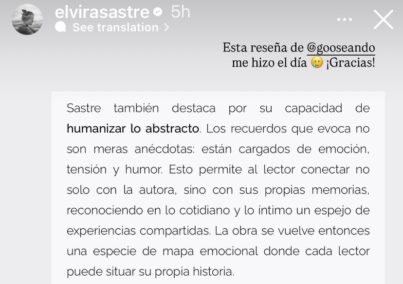 Ayyyy me emocioné mucho cuando vi tu mención 🥹 muchas gracias por estarme acompañando a través del tiempo y mis diferentes etapas. Me encanta que podamos conectar a través de estos espacios!! También me emocioné con el nuevo libro de Elvira Sastre, y apuntadas el resto de recomendaciones🙌🏼